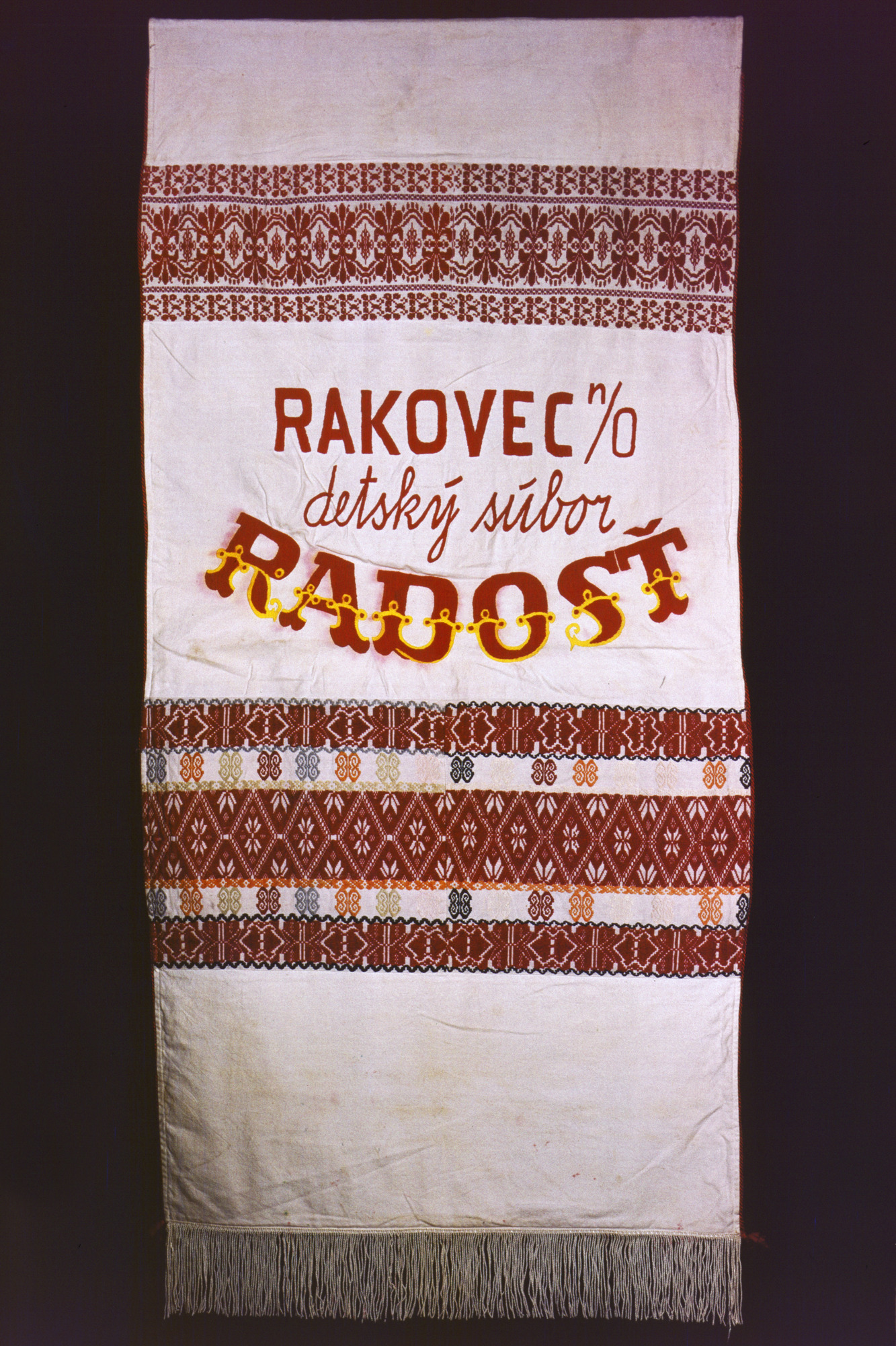 Descripton Folklórna zástava z obce Rakovec nad Ondavou. Ornamentník je zhotovený z pôvodnej domácej tkaniny z plachty s vyšitým názvom súboru na jednej a destkého súboru na jeho druhej strane. Celkový pohľad na jednu stranu ornamentníka s vyšitým názvom miestneho detského folklórneho súboru Radosť. Author Hrdinová, Agnesa (1938-)