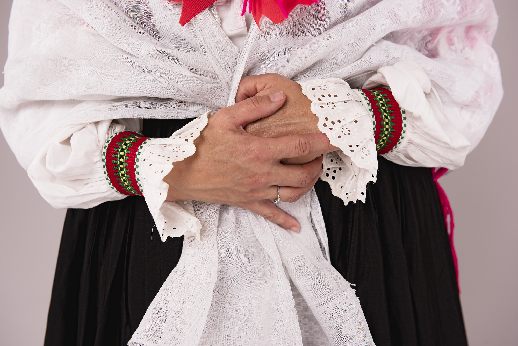 Descripton Odev tvoria biele plátenné spodničky, na ktoré sa oblieka zadná sukňa zvaná "kartunka" z kvetovaného kašmíru a predná čierna sukňa zvaná "zopaska". Sukne sú ozdobené hadovkami, prámikmi a fabrickými čipkami, predná zástera je olemovaná ružovou paličkovanou čipkou. Okolo pása sa na sukne viaže "opasovka", čo je vyšívaná stuha s hadovkami a "primkami" (prámikmi) na plátenom podklade. Na hornú časť tela patrí ako spodná vrstva ľanová "kosuľa" s tkanými "poštármi", čo sú prieramky tkané na krosnách. Košeľa je zapravená do spodničiek, má dlhé rukávy stiahnuté na zápästí manžetami. Na rázporku košele je na hrudi pripnutá červená mašľa z atlasovej, saténovej stuhy zvaná "ružička". Na košeľu patrí strieborný živôtik zvaný "reklik" alebo aj "kazajka". Okolo krku sa pripína skladaný "štikerajoví" (čipkovaný) golierik a štyri rady strieborných korálikov. Na hlavu patrí čepiec, na ktorý sa viaže veľká sýtoružová kašmírová šatka s kvetinovým vzorom zvaná "hustka" uzaviazaná vzadu. Na šatku sa zakladá cez plecia štóla, ktorej sa hovorí "rajntúch". Ide o štólu z veľmi tenkých ľanových nití so vzorom zatkávaným hrubšou niťou priamo do jemnej tkaniny. K odevu prislúchajú čierne kožené šnurovacie topánky. Pohľad na spôsob držania štóly, ktorá sa nepreväzuje, iba sa rukami pridŕža. General description Zimný variant ženského sviatočného odevu mladej ženy. "Rajntúch" sa nosil iba k sviatočnému odevu. Note Výskumný tím: Miroslav Hanák, Julián Ratica, Michal Veselský, Stanislava Tichá. Recorded by Veselský, Michal (1980-) Municipality of origin Ždiar Region of origin Spiš Performer Burgerová, Alžbeta od Vojtušof (1976-) Place of capture Ždiar Date of capture 27.9.2022 Subject Classification 4.4.1.1. Historické podoby tradičného ženského odevu Key words ženský odev
