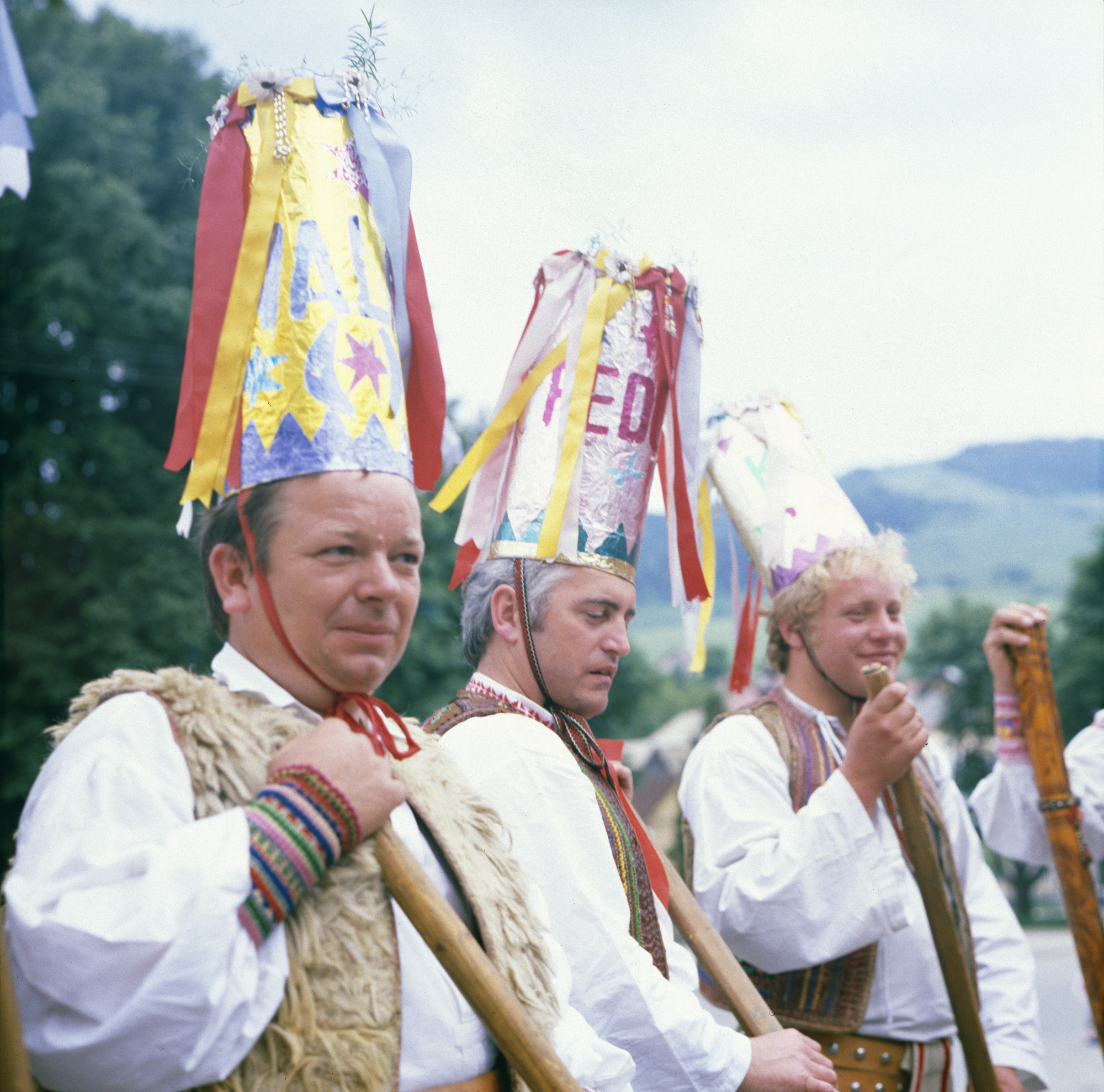Descripton Ľudová vianočná hra nazývaná gubajka, v ktorej vystupuje sedem postáv Fedor, Stacho, Bača, Kubo, Mladší valach, Starší valach, Starý. Bližší pohľad na troch mužov v tradičných odevoch s vysokými čiapkami, ktorí predvádzajú betlehemskú hru. Note Fotografia je súčasťou archívu Ondreja Dema. Municipality of origin Vlachovo Region of origin Gemer Performer Kováč, Milan