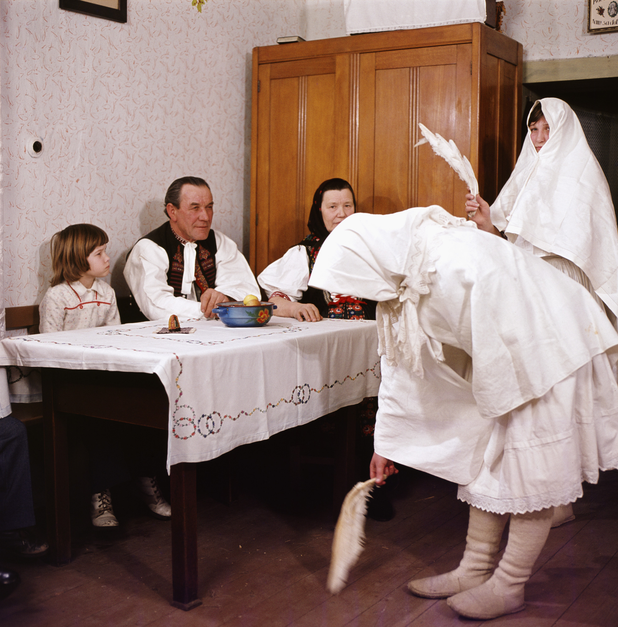 Descripton Dve maskované Lucie vymetajú príbytok husím krídlom. Oblečené sú v bielom. Za stolom prizerajúca sa rodina. General description Na Luciu, sa mládenci obliekli za Lucie: biele rubáše, plachty na hlavy, do ruky biele husacie krídlo. Chodili z domu do domu, vymetali zlo z kútov izieb. Nezaobišlo sa to bez vtipných prekáračiek a drobných zlomyselností, ktoré robili dievkam. Note Výskumník Stanislav Dúžek. Recorded by Szabó, Tibor (1935-2014) Municipality of origin Horná Súča Region of origin Stredné Považie Performer Zemanovič, Imrich