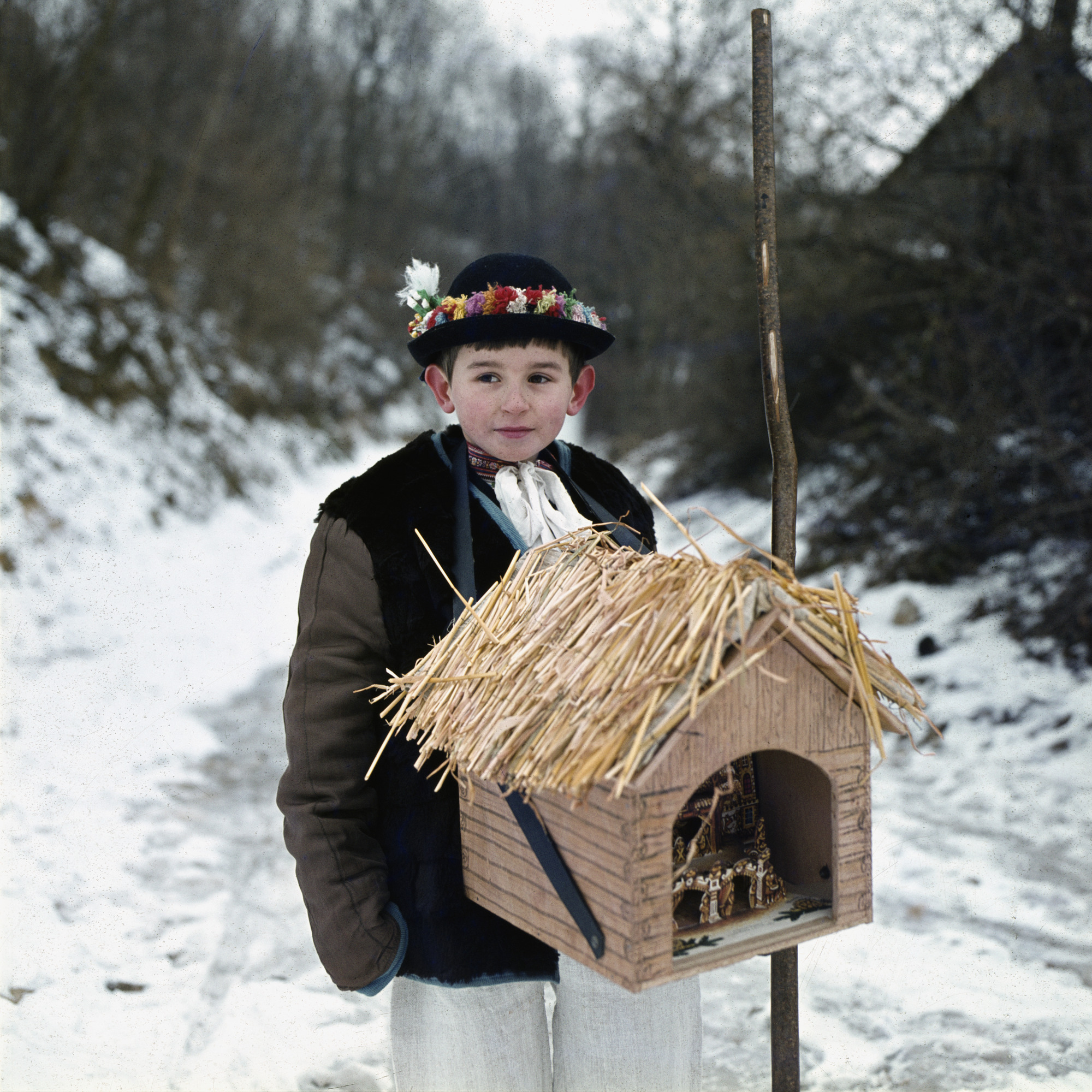 Descripton Chlapec s betlehemom okolo krku počas vianočnej obchôdzky. Recorded by Szabó, Tibor (1935-2014) Municipality of origin Selec Region of origin Stredné Považie Place of capture Selec Date of capture 1978 Subject Classification 3.2. Kalendárne sviatky a obyčaje