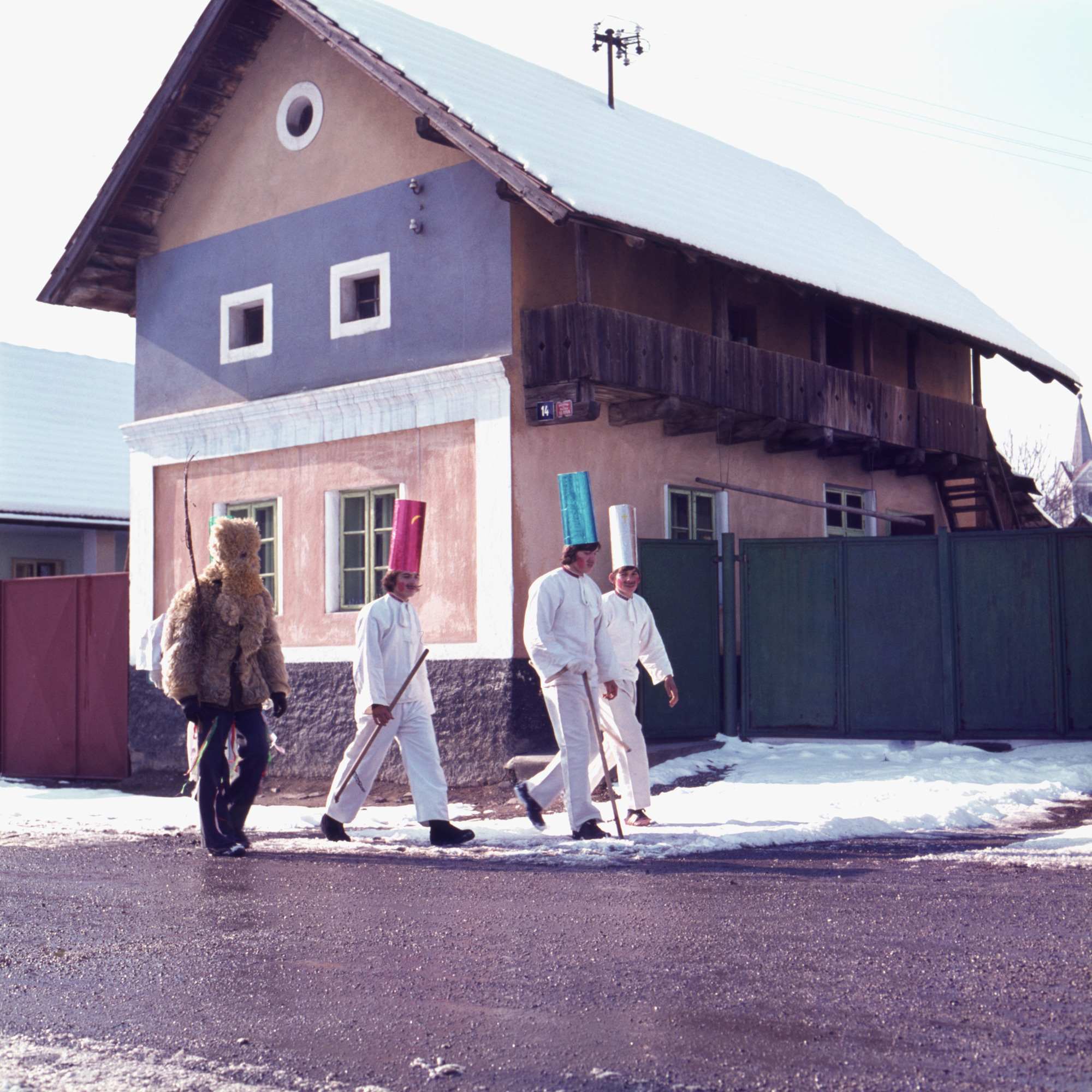 Descripton Ľudová vianočná hra, v ktorej vystupuje päť postáv: Anjel, Fedor, Stacho, Junák a Kubo. Skupina betlehemcov počas vianočnej obchôdzky dedinou. Zľava: Pavel Seriš (Kubo), Julián Mrázik (Stacho), Pavol Guga (Fedor), Ľuboš Gaží (Junák). Recorded by Szabó, Tibor (1935-2014) Municipality of origin Horná Súča Region of origin Stredné Považie Performer Seriš, Pavel (1959-)