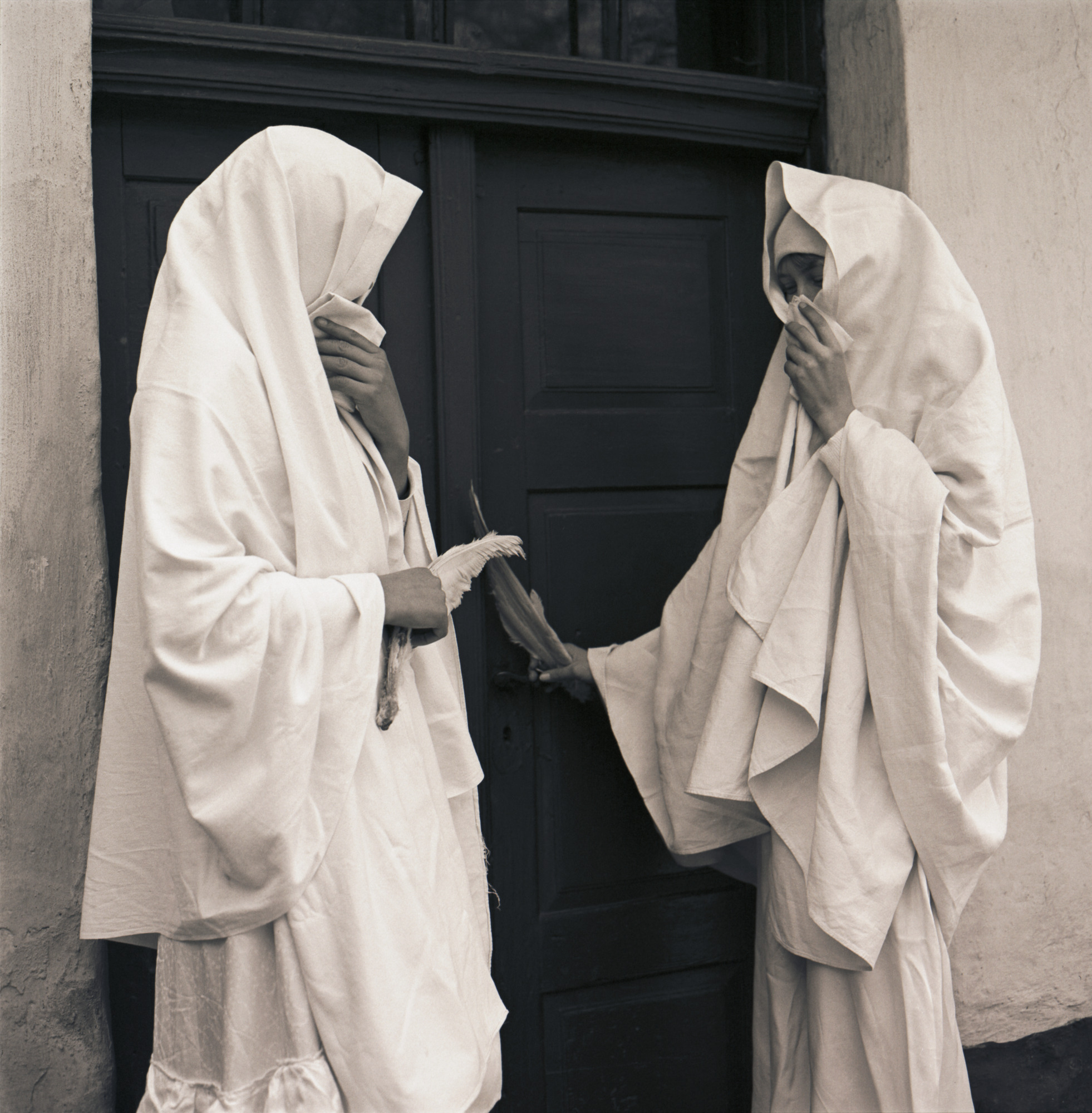 1. Descripton Na obchôdzky chodilo viac skupiniek Lucií, od menších dievčat (školáčiek) až po dievky. Dve maskované Lucie pred vchodom do obytného domu. Sú oblečené v bielom a v ruke držia husie krídlo.