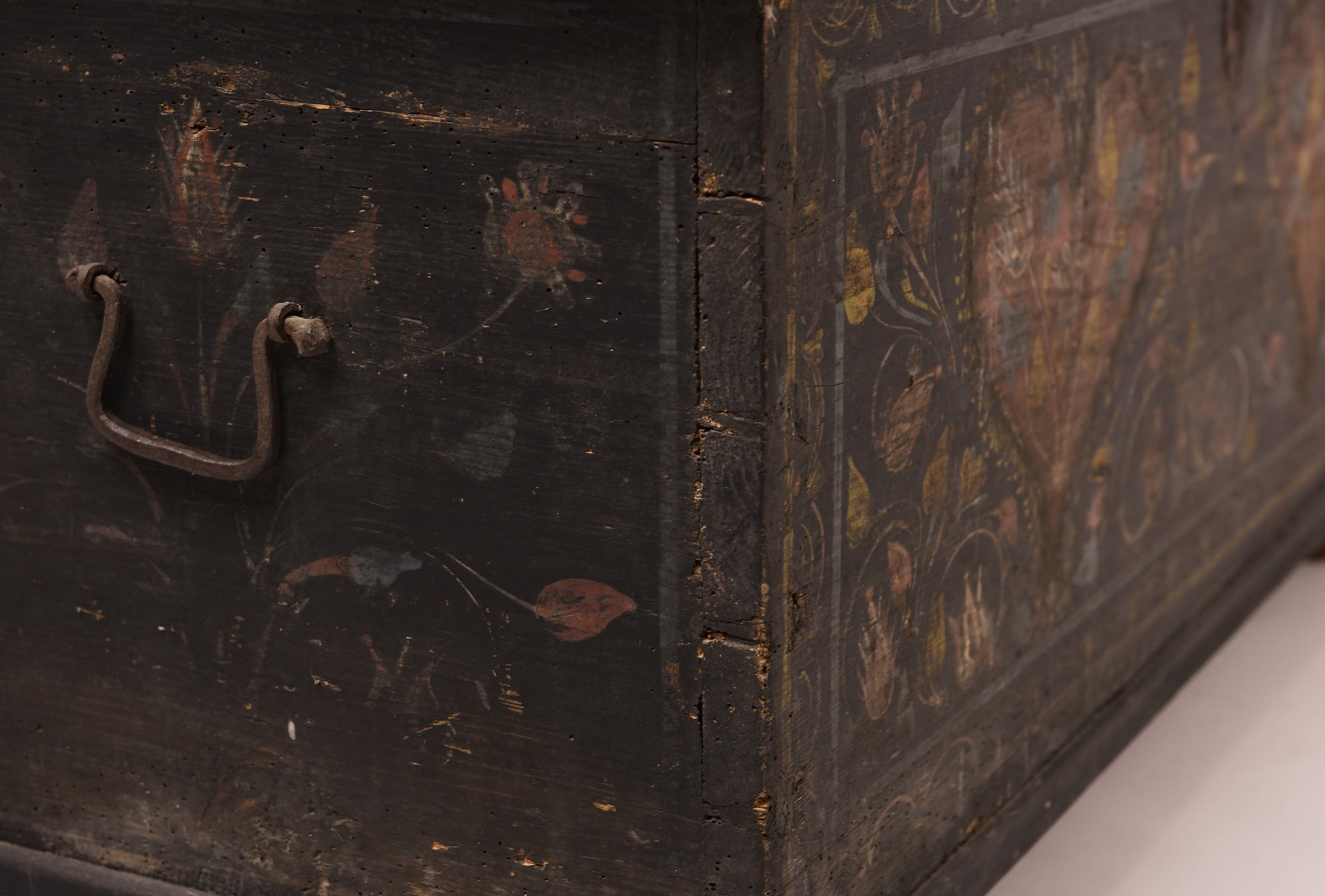 Popis Drevená uzamykateľná svadobná truhlica vyrobená z mäkkého dreva, z navzájom čapovaných dosiek, s plochým vrchnákom. Telo truhlice nesú guľaté drevené nohy. Truhlica je zdobená maľbou s rastlinným motívom. Základný náter truhlice je čierny. Výzdobu na čelnej strane tvoria dve veľké červené srdcia, v ktorých je rastlinný motív - asymetrická kytica kvetov a pukov v žltej, modrej a bielej farbe. Srdcia sú olemované bielou linkou, modrými bodkami a žltými škvrnami na spôsob fládrovania. Obe srdcia sú ohraničené veľkým obdĺžnikom, ktorý kopíruje tvar truhlice. Priestor vo vnútri obdĺžnika medzi srdciami je celý vyplnený dlhými farebnými úponkami rastlín a kvetov v modrej, žltej a červenej farbe. Obdĺžnik lemuje ďalšia žltá linka s malými oblúčikmi otočenými dovnútra, medzi každým je malý žltý lístok. Boky truhlice zdobí jedoduchá kytica kvetov. Truhlica má hranaté kovové držadlá na prenášanie. Rozmery: šírka 121 cm, hĺbka 57 cm, výška 58 cm, vnútorná výška 43 cm. Pohľad na miesta spojov technikou čapovania a kovové držadlo na boku. Poznámky Truhla slúžila na prevoz svadobnej výbavy nevesty, následne na ukladanie odevu a bytového textilu.