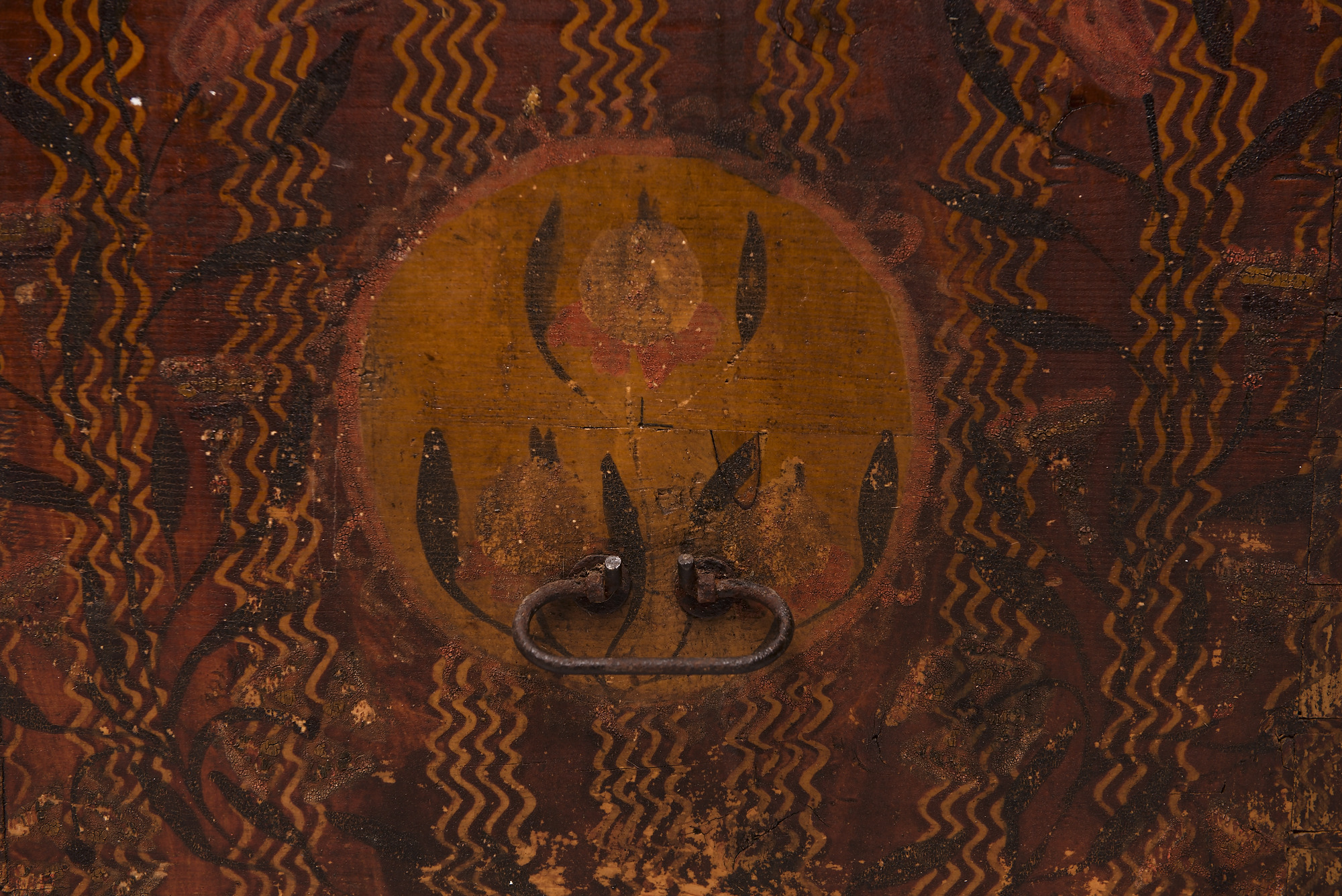 Popis Drevená uzamykateľná svadobná truhlica vyrobená z mäkkého dreva, z navzájom čapovaných dosiek, s plochým vrchnákom. Telo truhlice nesú doskové ozdobne profilované nohy. Truhlica je zdobená maľbou s geometrickým a rastlinným motívom s použitím techniky fládrovania. Základný náter truhlice je hnedý. Výzdobu na čelnej strane tvoria dva menšie kruhy, uprostred ktorých sú tmavou frabou maľované kvety a močiarne pálky. Priestor okolo kruhov je zdobený zvislými vlnovkami na spôsob fládrovania. Cez fládrovanie sú namaľované čiernou farbou rastliny močiarnej pálky, ktoré vytvárajú okolo kruhov tvar ratolesti. Boky zdobí rovnaký motív s jedným kruhom uprostred, v strede ktorého je kovové držadlo na prenášanie. Doskové nohy sú takisto zdobené fládrovaním a maľovanými rastlinkami. Truhlica má dva zámky. Jeden bol dorobený časom, keď sa truhlica začala používať na uskladnenie obilia. Rozmery: šírka 110 cm, hĺbka 57 cm, výška 67,5 cm, vnútorná výška 47 cm. Pohľad na výzdobu a držadlo na boku. Poznámky Truhla slúžila na prevoz svadobnej výbavy nevesty, následne na ukladanie odevu a bytového textilu.
