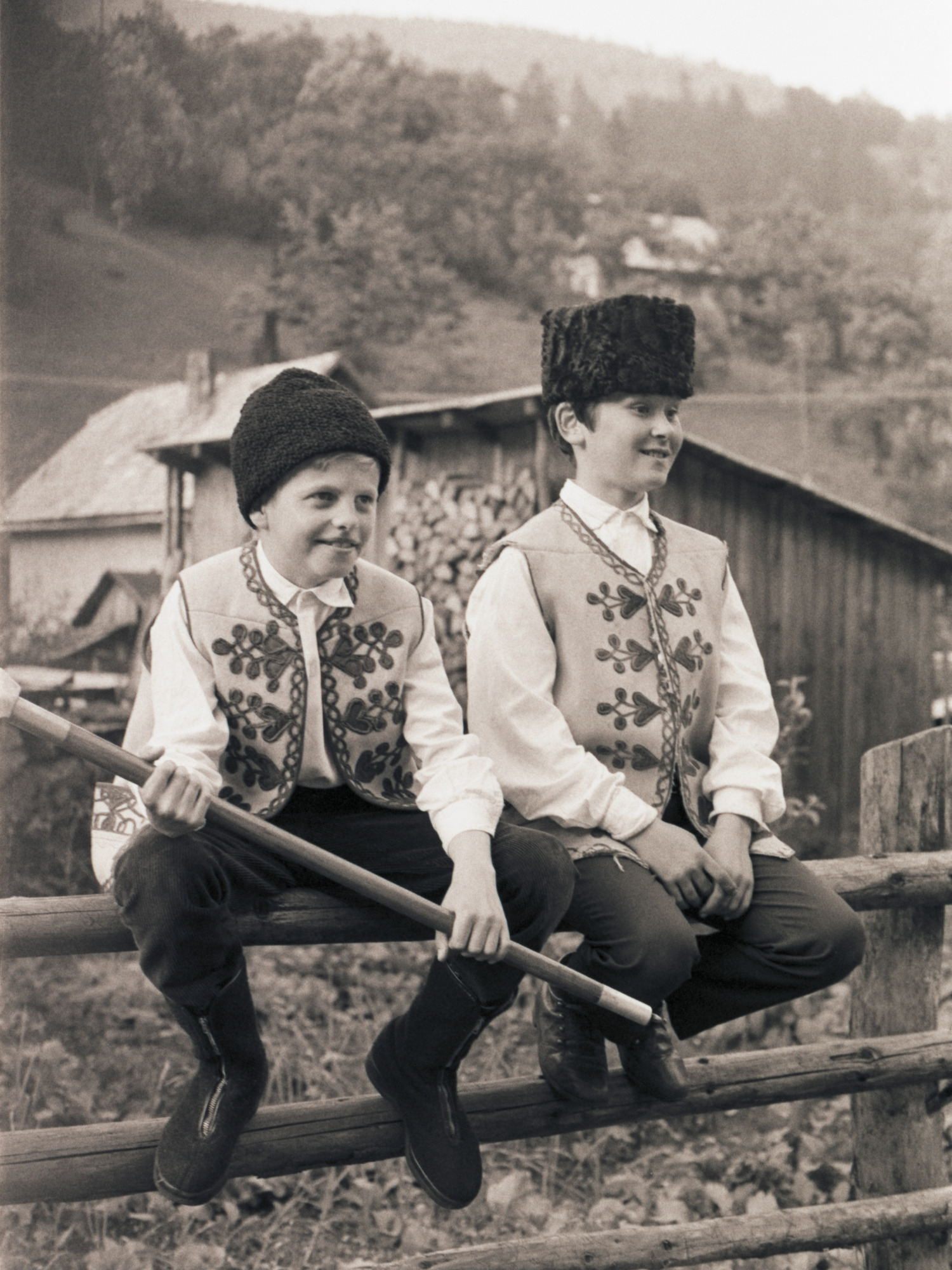 1. Popis Betlehemci počas vianočnej obchôdzky. Pohľad na postavy Baču (Stanislav Jesenský) a Honelníka (Zdeno Plánka).
